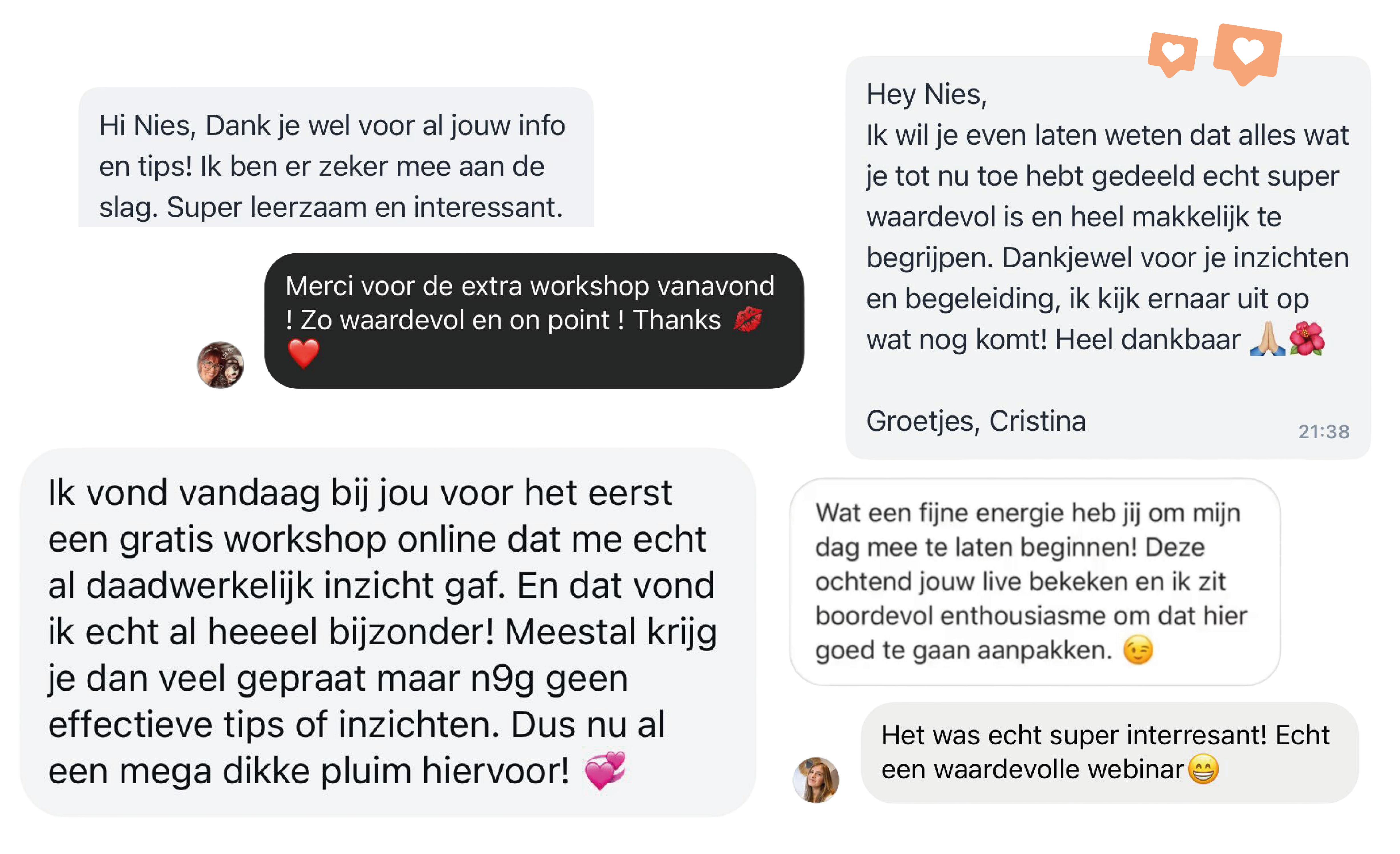 Nies! Mijn webinar was nog niet gedaan en de verkopen liepen al binnen. Waanzinnig wat ik van jou al heb mogen leren.